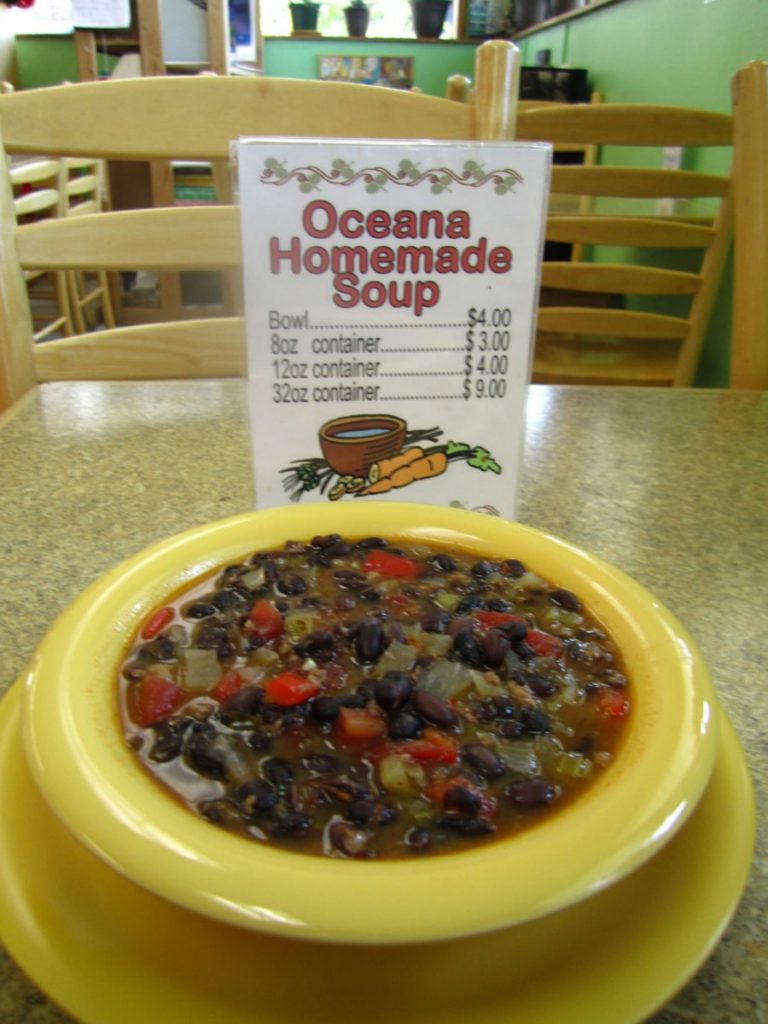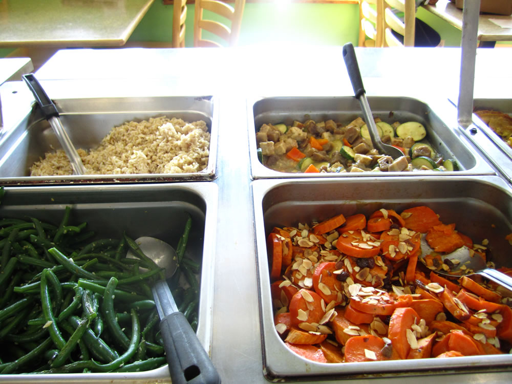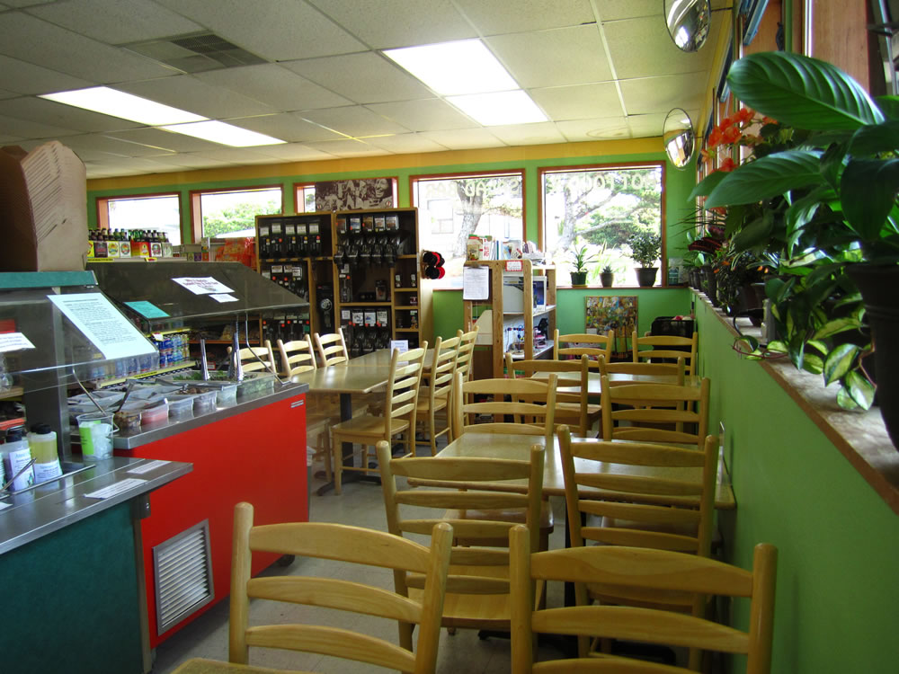 - Sit-down eating area with salad bar on weekdays 8 a.m. -6 p.m. All food prepared on-site. To-go containers for everything. Muffins, scones, and hot soup available daily.